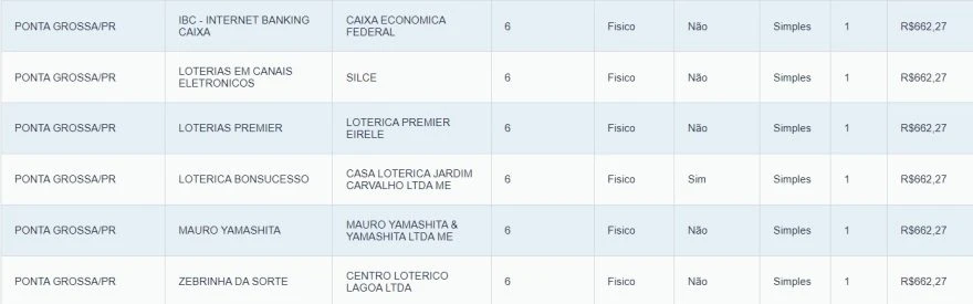 A quina teve 116 apostas vencedoras, que irão receber R$ 29.262,50 cada. Outras 7.322 apostas tiveram quatro acertos e faturaram R$ 662,27. Em Ponta Grossa, seis apostas acertaram as quatro dezenas. Confira abaixo onde elas foram feitas: