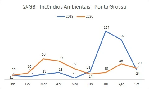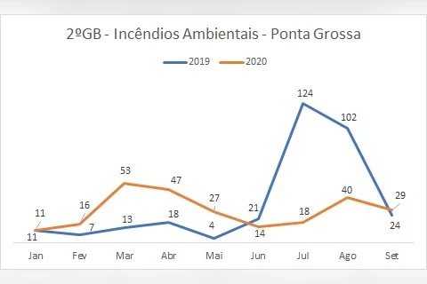 Segundo informações dos bombeiros, os incêndios ambientais apresentaram queda no ano de 2020. Por exemplo, até o momento o mês de setembro registrou 24 ocorrências dessa natureza, no mesmo mês do ano passado foram registrados 29 casos.