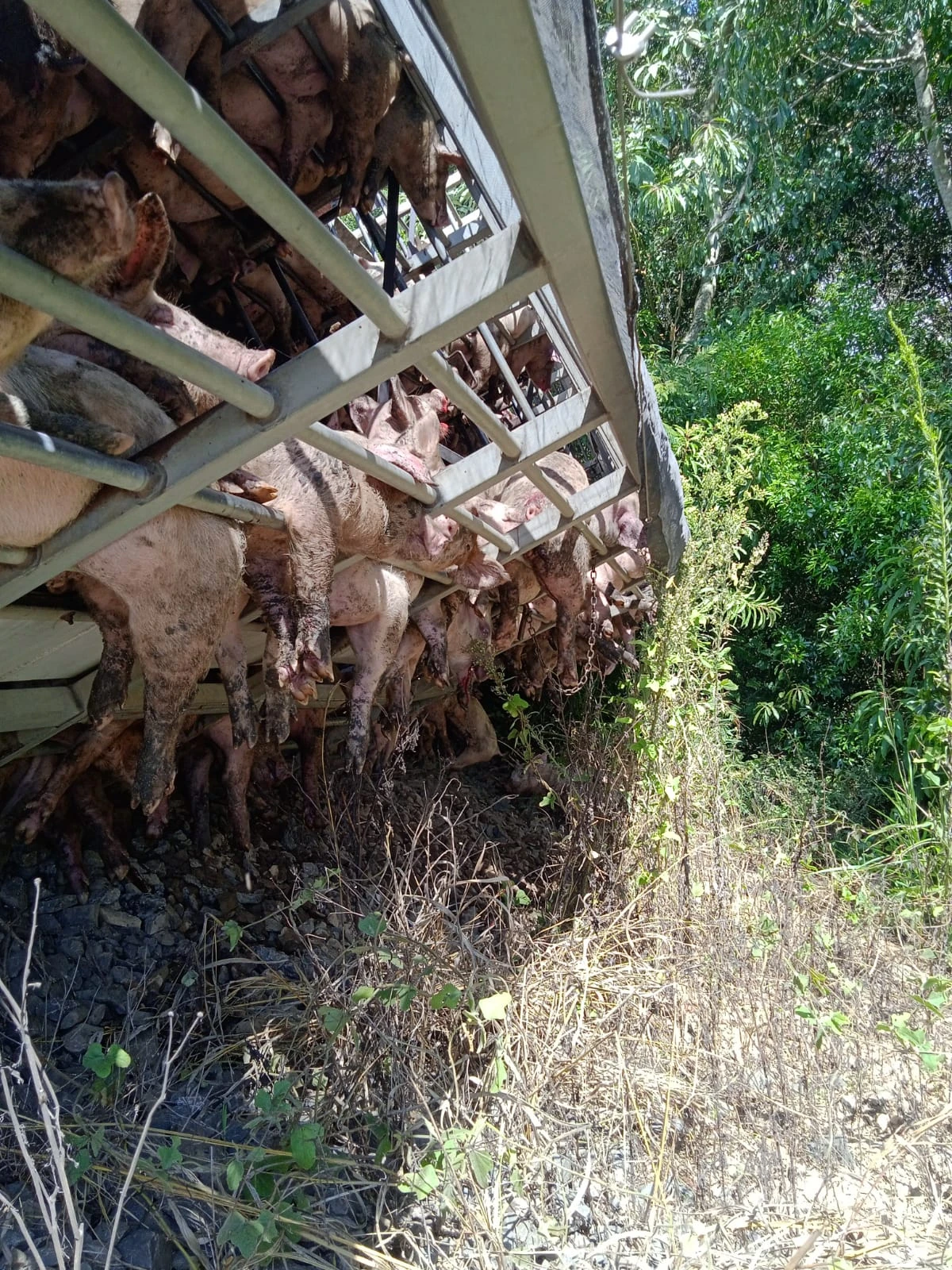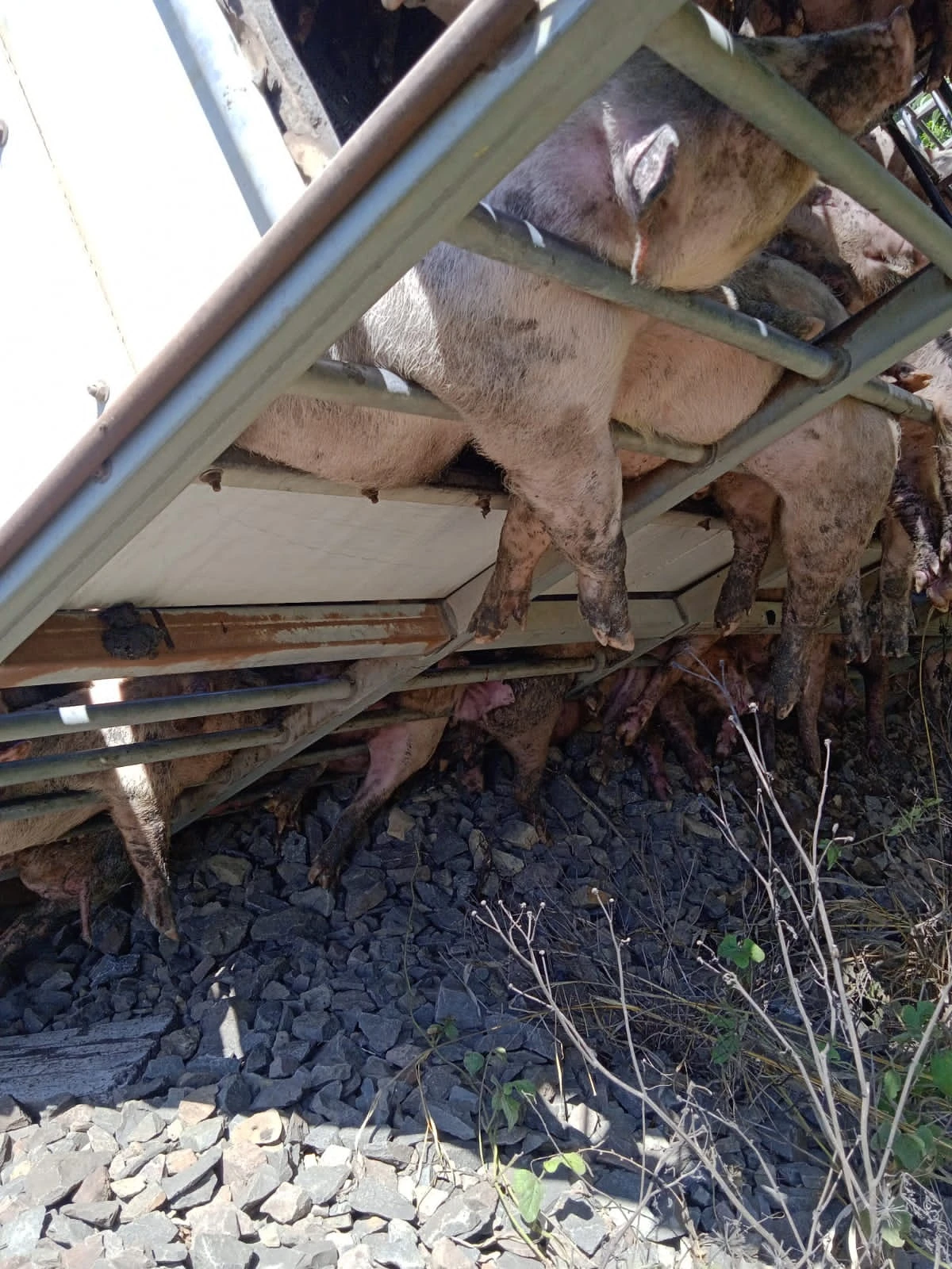 Em imagens divulgadas em grupos de WhatsApp, é possível ver que o caminhão acabou tombando com a colisão e a carga de suínos ficou presa no veículo.