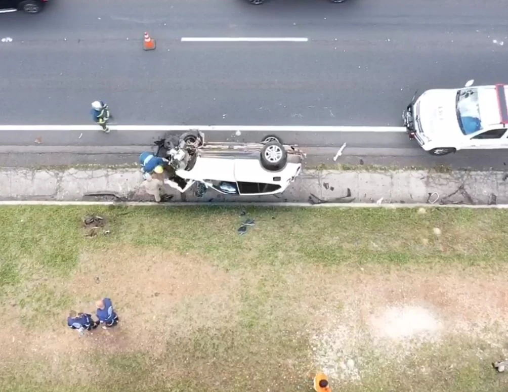 Um veículo BMW, com placas de Guarapuava, que seguia na pista sentido Curitiba, invadiu o canteiro central, atropelou um homem que trabalhava no canteiro central e em seguida o carro capotou.