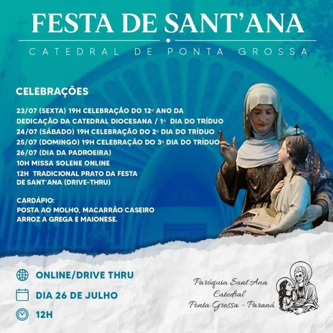 Na próxima segunda-feira, dia 26 de julho, é comemorado o Dia de Sant'Ana, padroeira de Ponta Grossa e feriado municipal. Para comemorar a data, a Catedral da cidade, que leva o nome da avó de Jesus, preparou uma série de celebrações para a tradicional Festa de Sant'Ana.