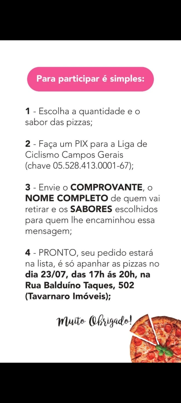 O valor arrecadado com a venda das pizzas será revertido totalmente para os custos da viagem das ciclistas. Cada pizza custa R$ 35 ou 3 pizzas por R$ 100. Os sabores são: calabresa, quatro queijos, marguerita e goiabada. A retirada das pizzas acontecerá nesta sexta-feira (23), das 17 às 20h, na rua Balduíno Taques, 502, na Imobiliária Tavarnaro.