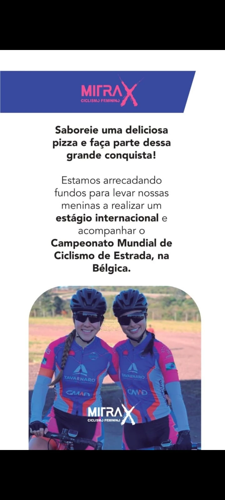 Kika Gerlinger, integrante da equipe MitraX, explica que a dupla já é destaque no ciclismo de estrada e foi convidada para o estágio na Europa. Para custear as despesas da viagem de dois meses, a equipe está promovendo a venda de pizzas. "A nossa primeira providência foi formar uma equipe de ciclismo, que é a MitraX. Conseguimos patrocinadores para uniforme e equipamentos, mas para elas viajarem, elas precisam de passagem aérea, seguro, elas precisam da alimentação também", afirma.