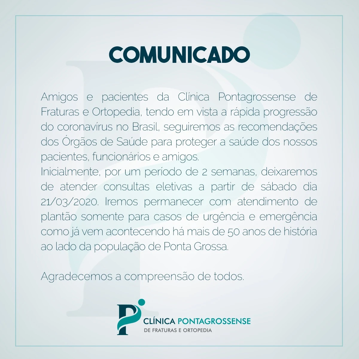 Assim como outras empresas que vem suspendendo as atividades, com o intuito de conter a propagação do novo coronavírus, a Clínica Pontagrossense de Fraturas e Ortopedia anunciou nesta sexta-feira (20) a suspensão dos atendimentos eletivos.