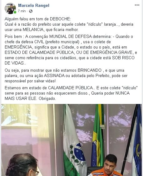 O prefeito Marcelo Rangel usou as redes sociais na tarde desta terça-feira (07) para desabafar sobre uma crítica que havia recebido recentemente sobre a utilização do colete de cor alaranjada da Defesa Civil. Em diversas ocasiões o chefe do Executivo Municipal apareceu vestindo o acessório.