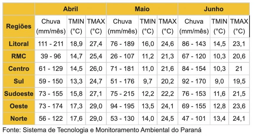 Confira as médias mensais históricas da faixa de variação da chuva, temperaturas mínimas e máximas por região do Paraná nos meses do outono: