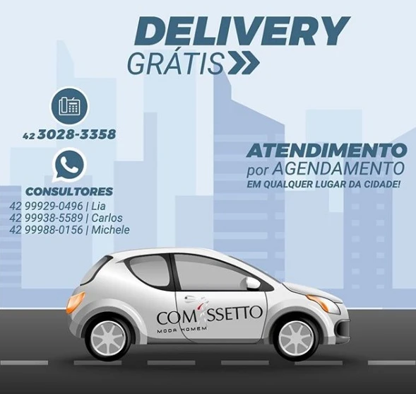 As lojas Comassetto Moda Homem realizam as entregas de segunda a sexta-feira das 10 às 18h. O atendimento também é feito pelo WhatsApp, onde podem ser enviadas fotografias de produtos disponíveis nas lojas. Outro diferencial, é que ao solicitar o delivery, o cliente pode também pedir para que seja levada a máquina para efetuar o pagamento no cartão de crédito ou débito.