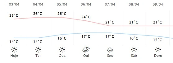 Na quarta-feira (5), as temperaturas ficam entre 16ºC e 26ºC. Já na quinta-feira (6), o tempo deve ficar parcialmente nublado com pancadas de chuva. O tempo muda na sexta-feira (7), quando deve chover o equivalente a 21.7 milímetros, com mínima de 17ºC e máxima de 21ºC.
