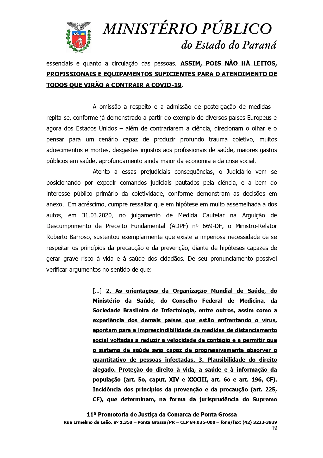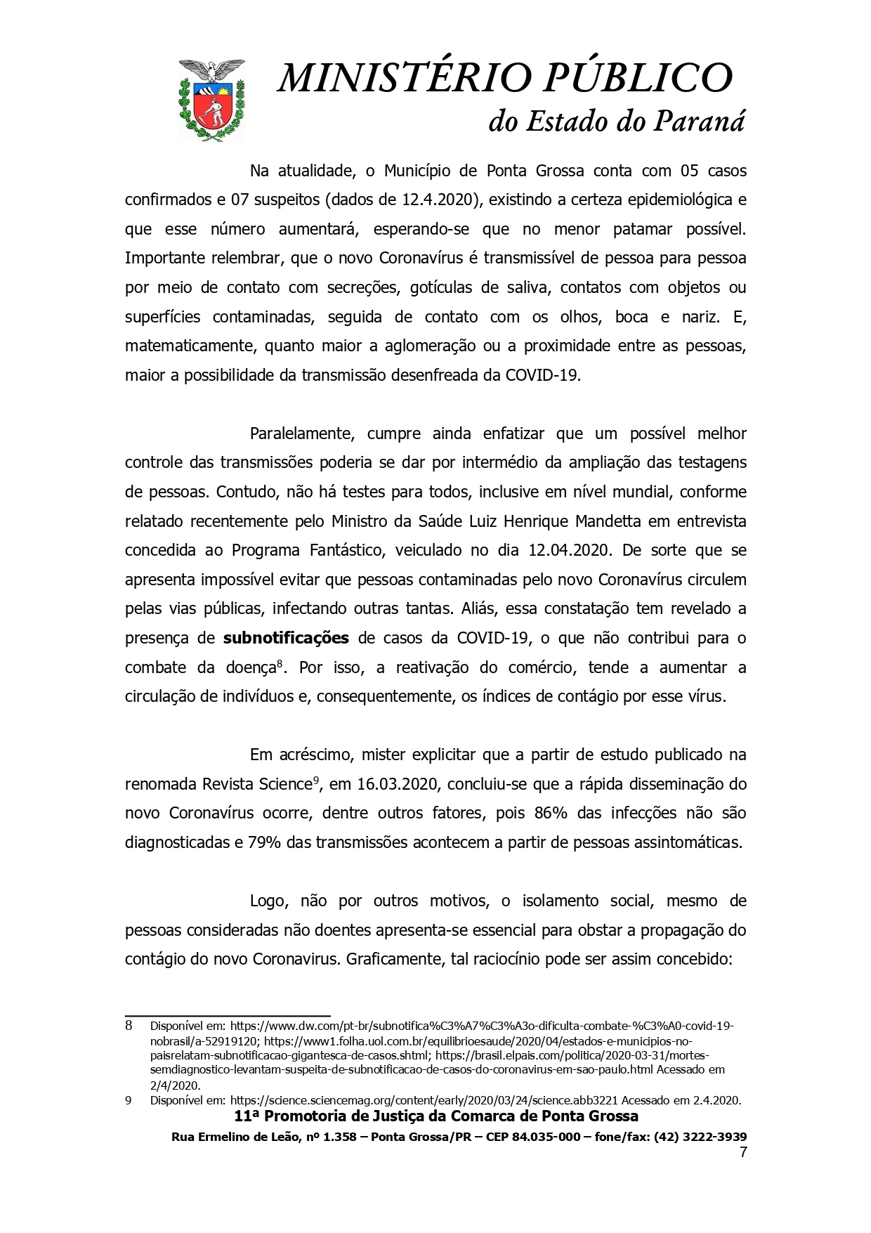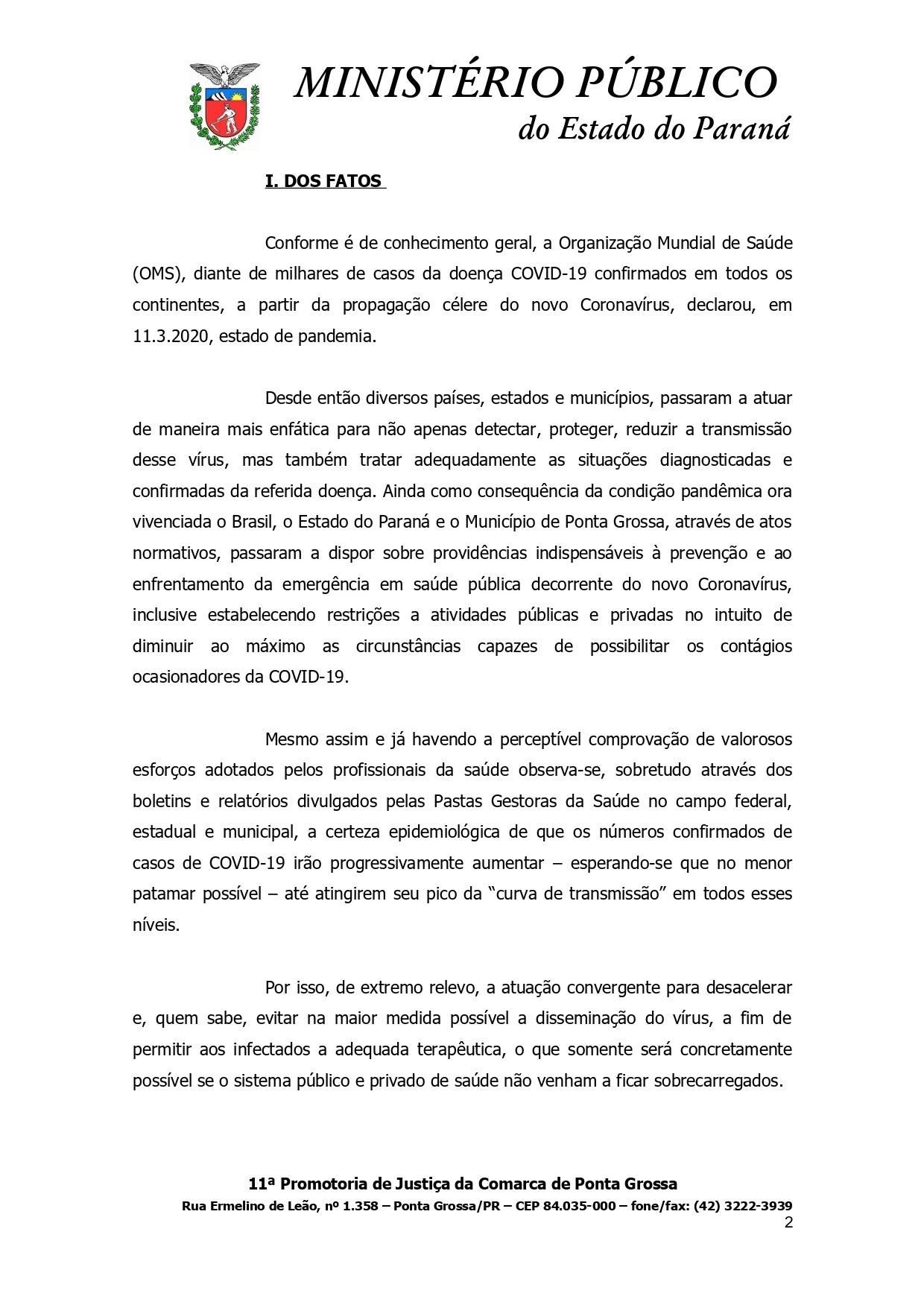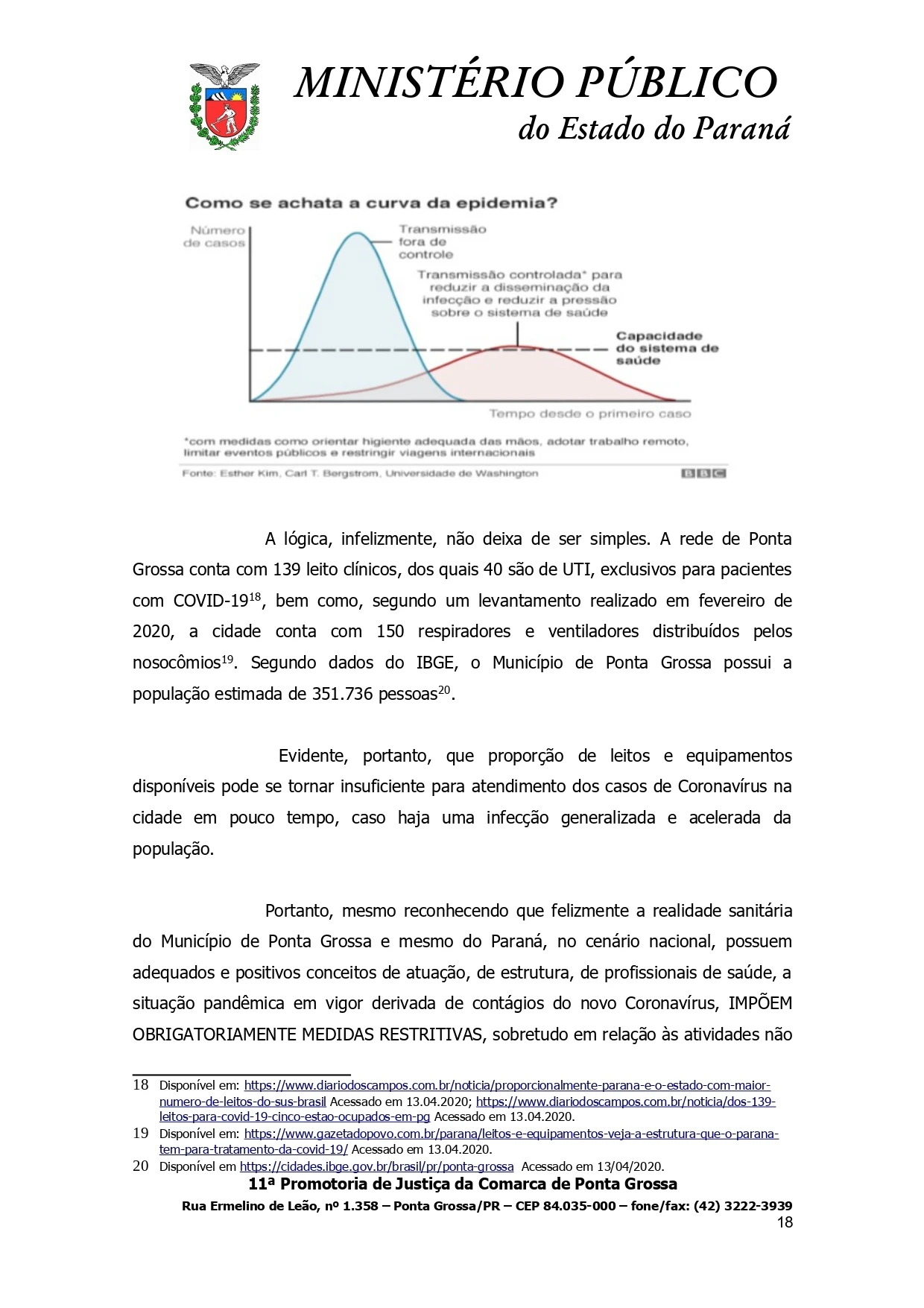 A promotora lembra que o município possui seis casos confirmados e outros dois pacientes com suspeita de COVID-19. "Mesmo já havendo a perceptível comprovação de valorosos esforços adotados pelos profissionais da saúde observa-se, a certeza epidemiológica de que os números confirmados de casos de COVID-19 irão progressivamente aumentar até atingirem seu pico da “curva de transmissão” em todos esses níveis", frisa.