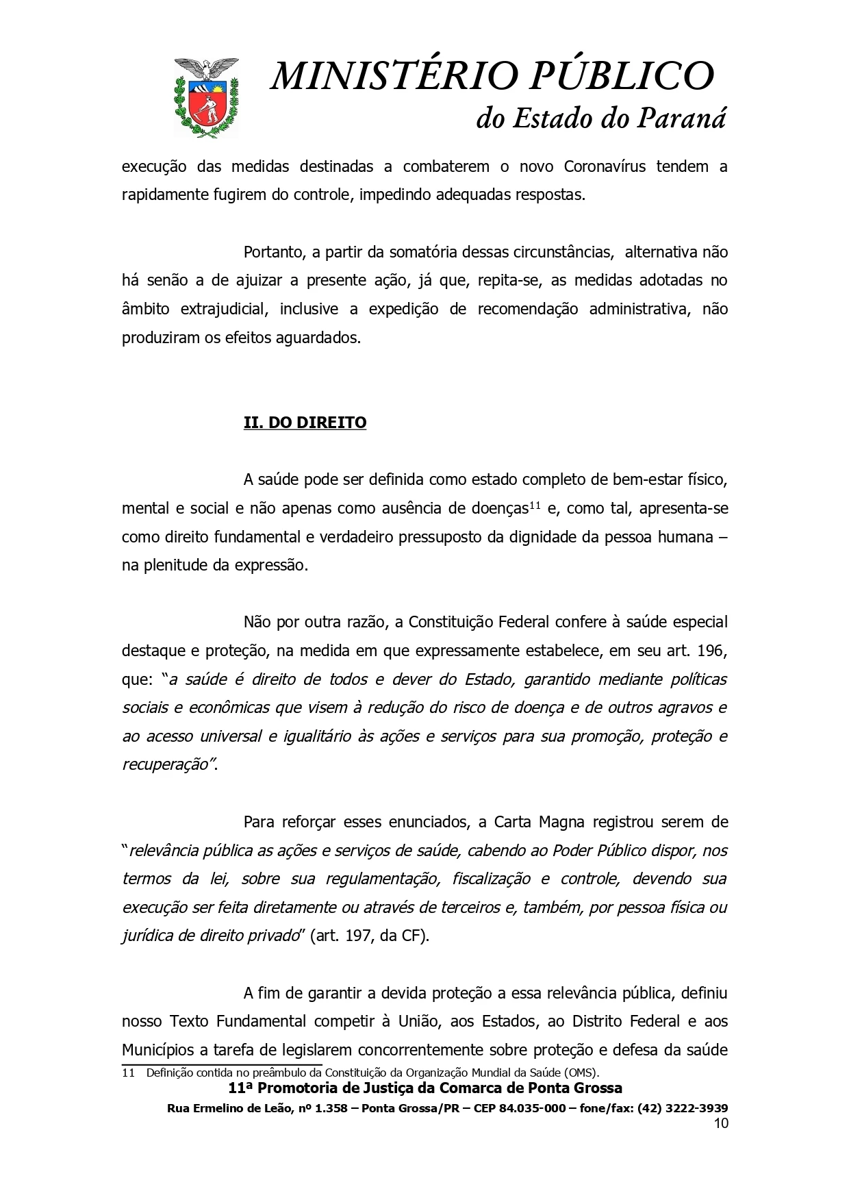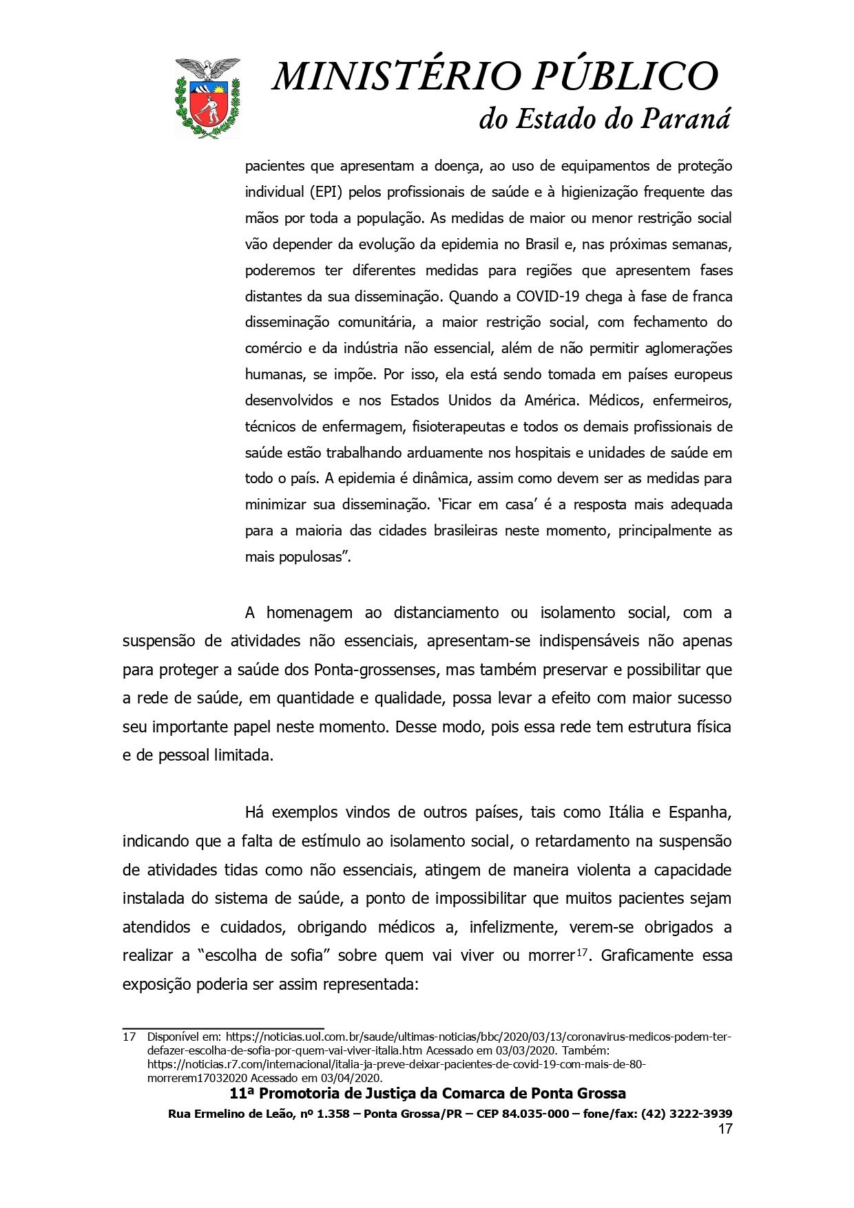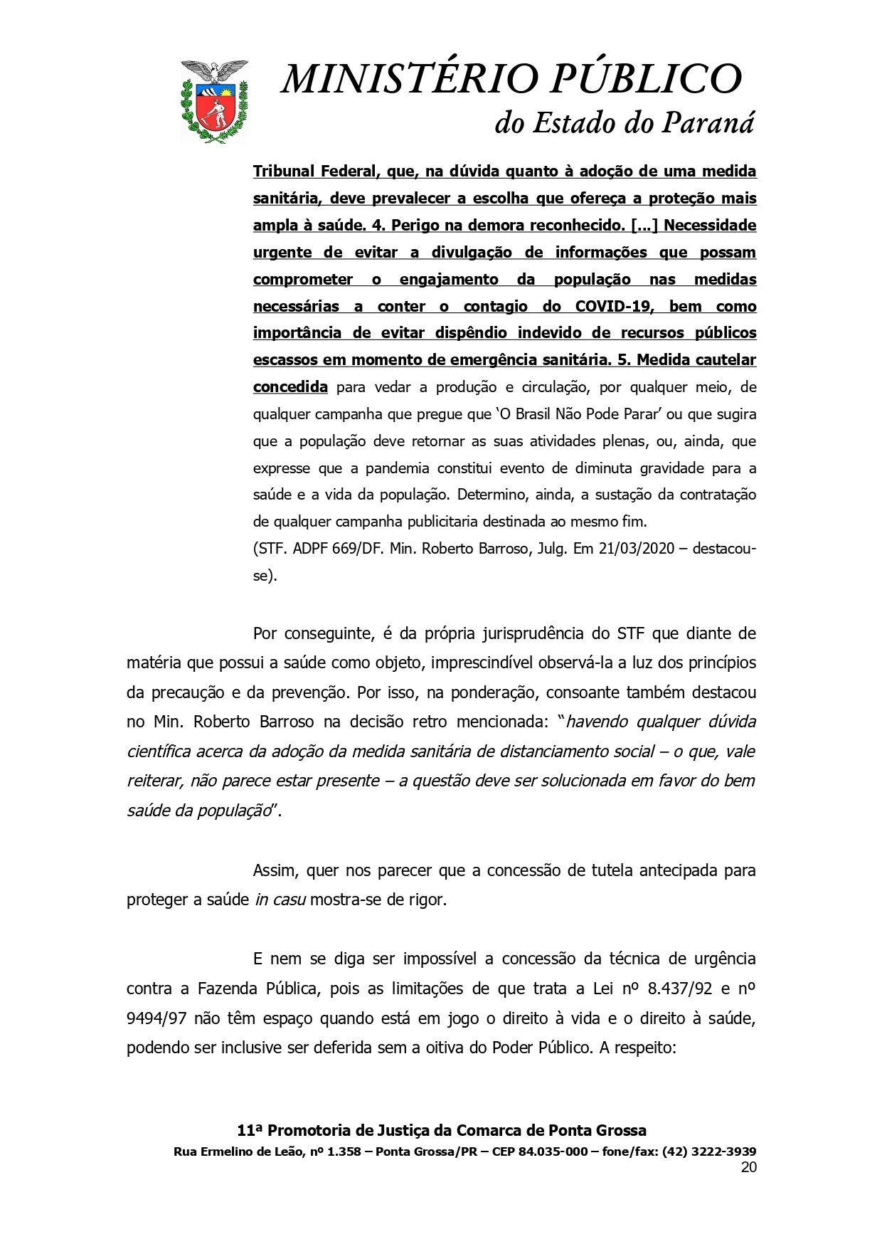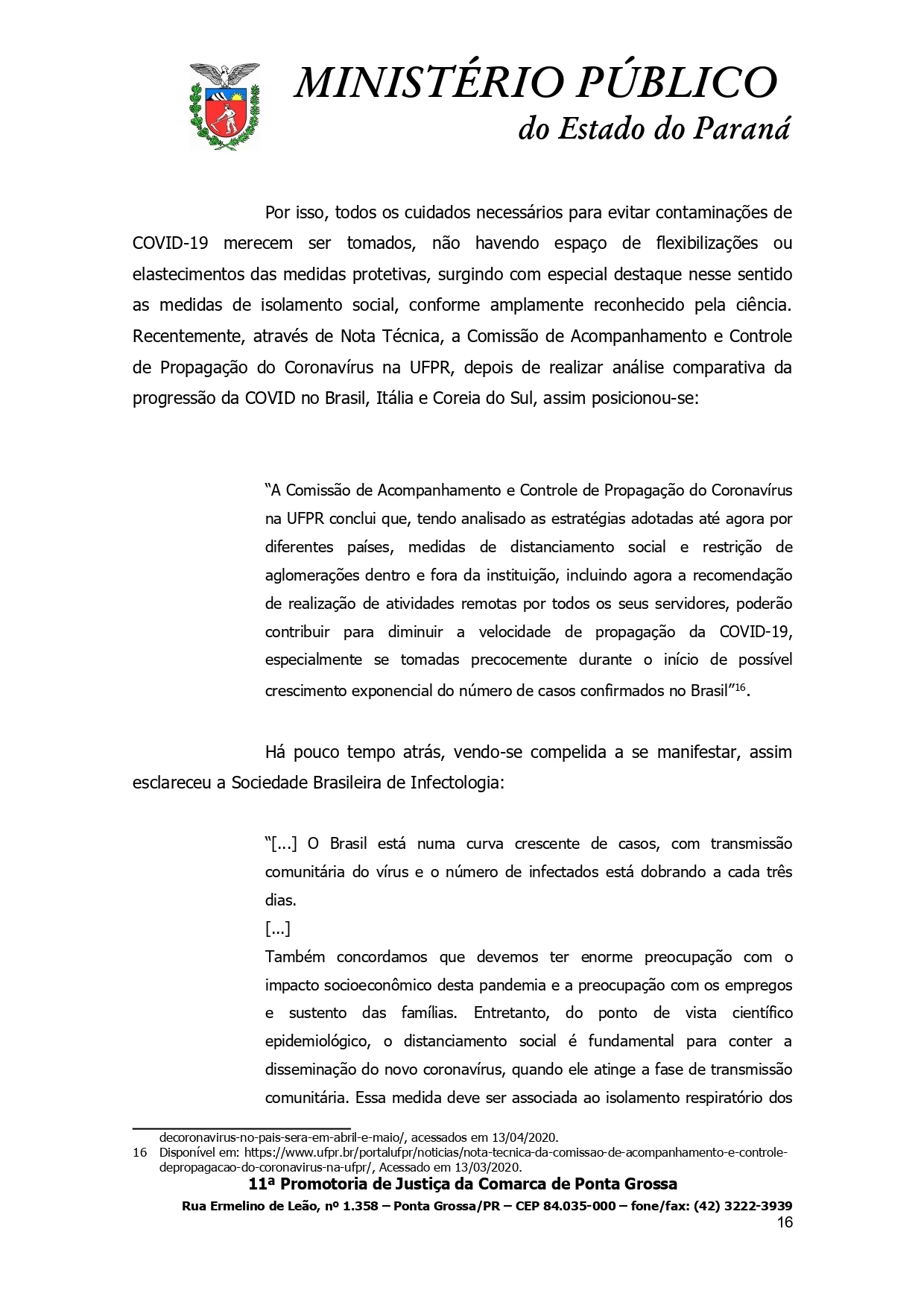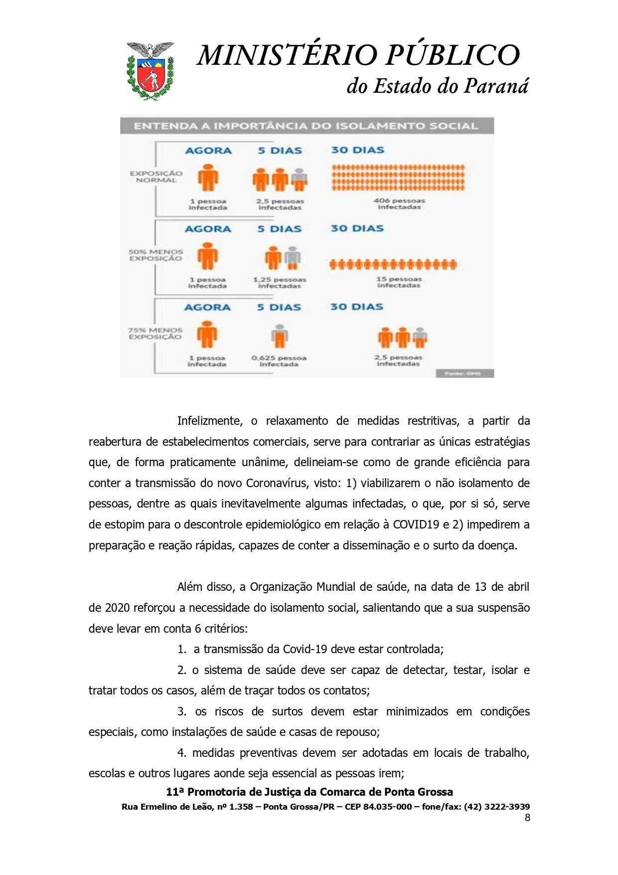 A promotora lembra que o município possui seis casos confirmados e outros dois pacientes com suspeita de COVID-19. "Mesmo já havendo a perceptível comprovação de valorosos esforços adotados pelos profissionais da saúde observa-se, a certeza epidemiológica de que os números confirmados de casos de COVID-19 irão progressivamente aumentar até atingirem seu pico da “curva de transmissão” em todos esses níveis", frisa.