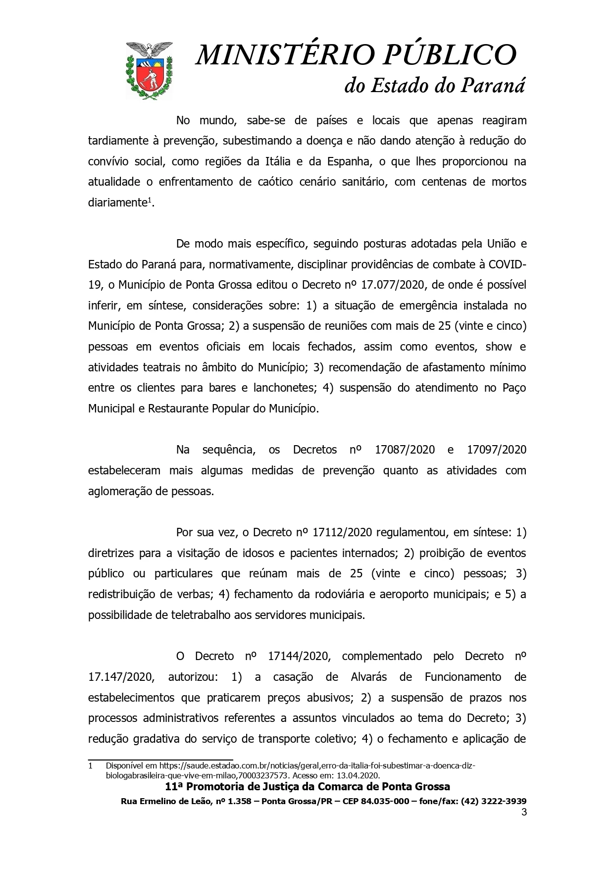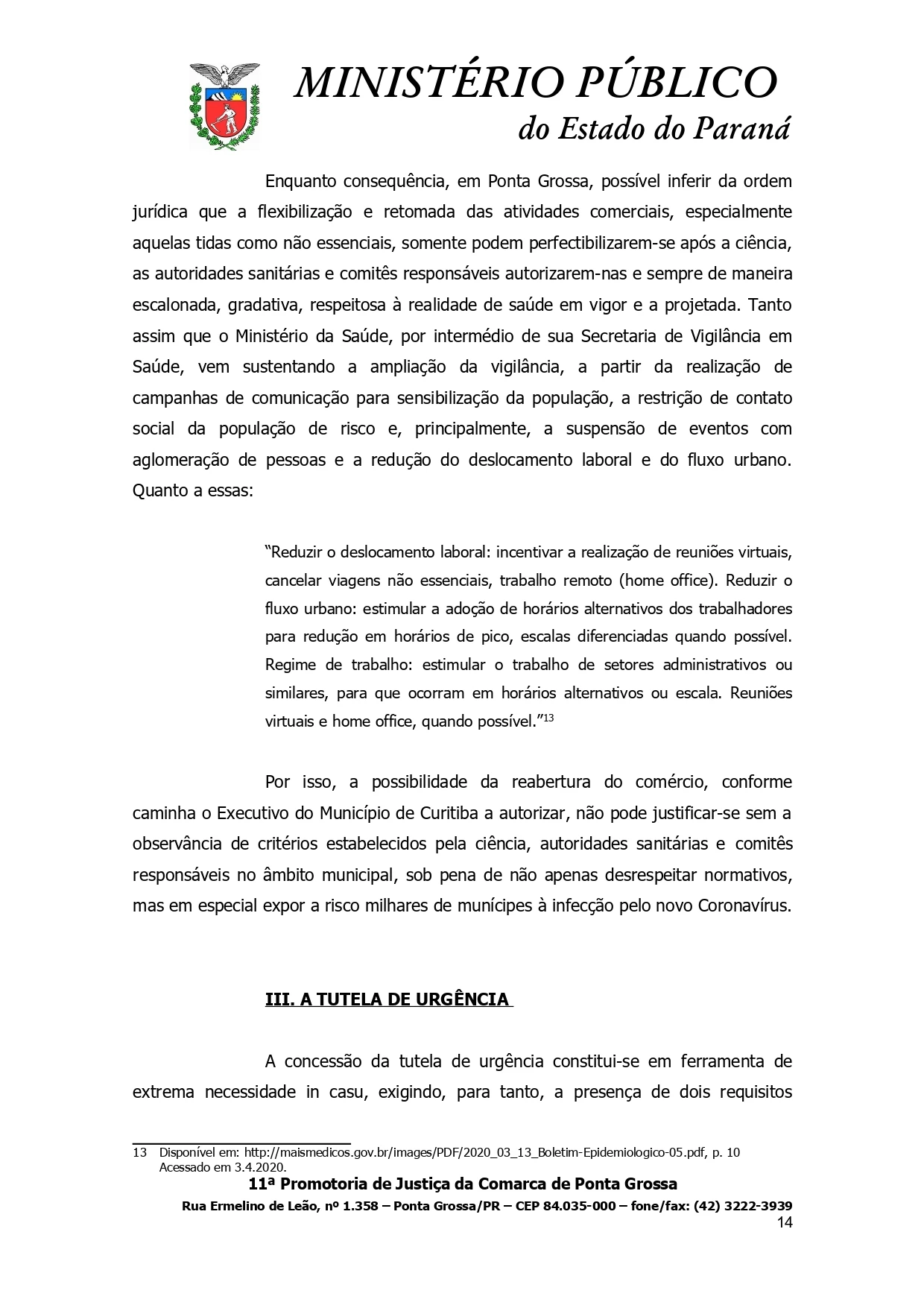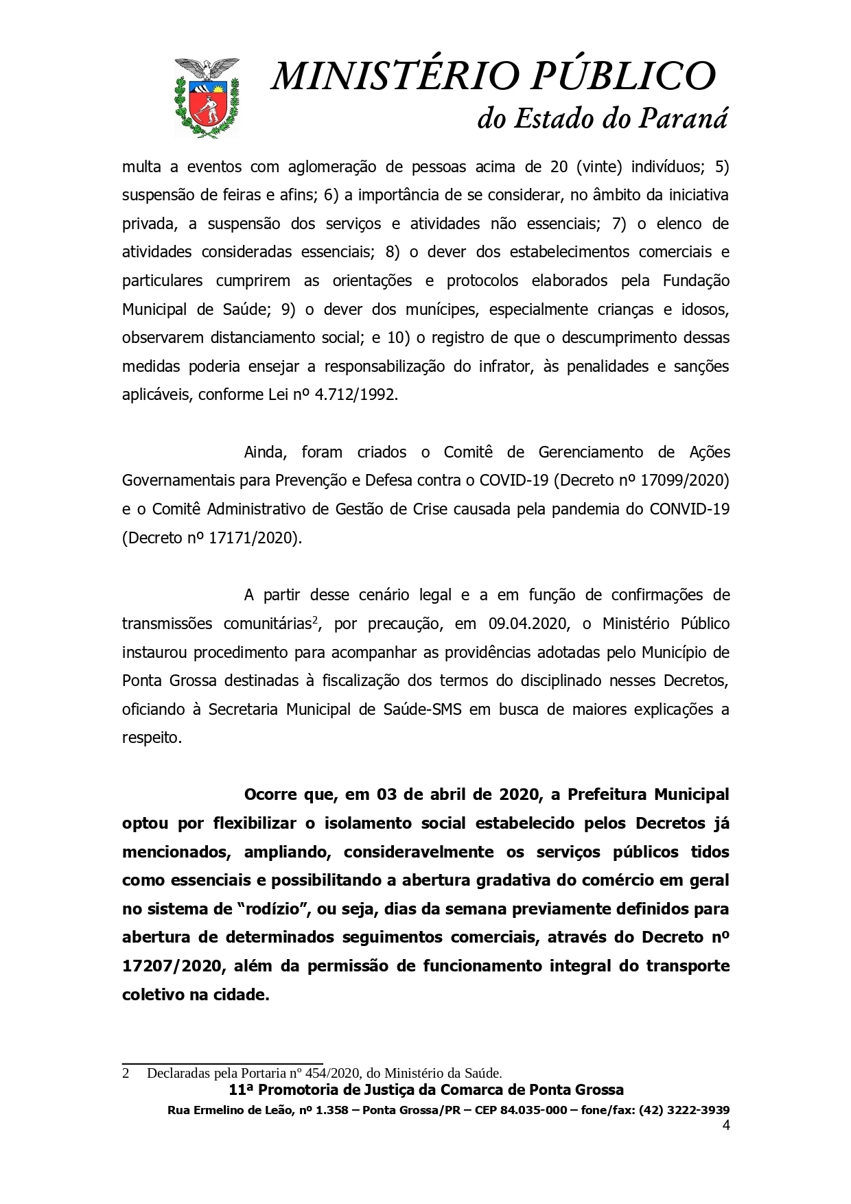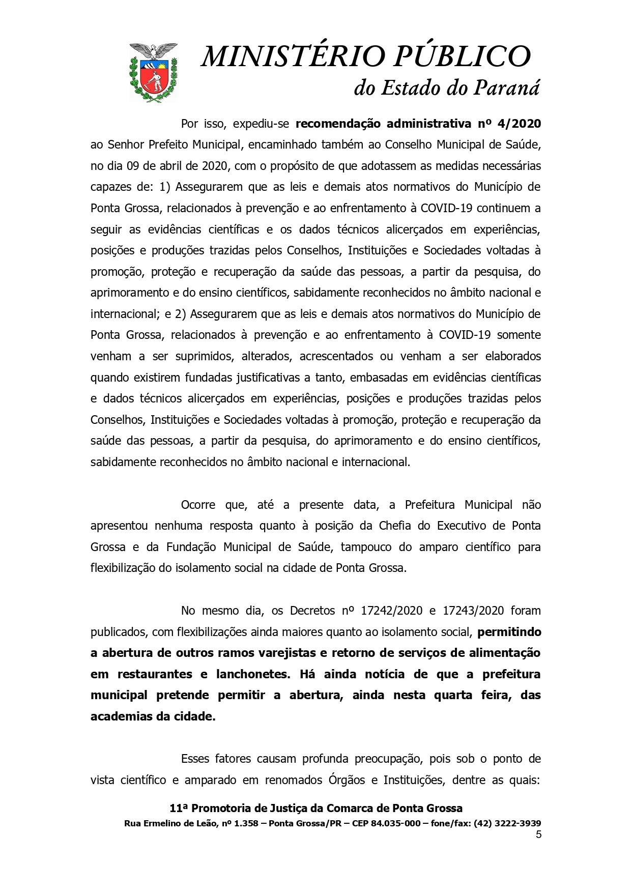 No dia 09 de abril, o MP fez recomendações administrativas sobre a reabertura gradual do comércio e pediu que a Prefeitura enviasse dados técnicos que embasaram a decisão, mas não houve resposta.