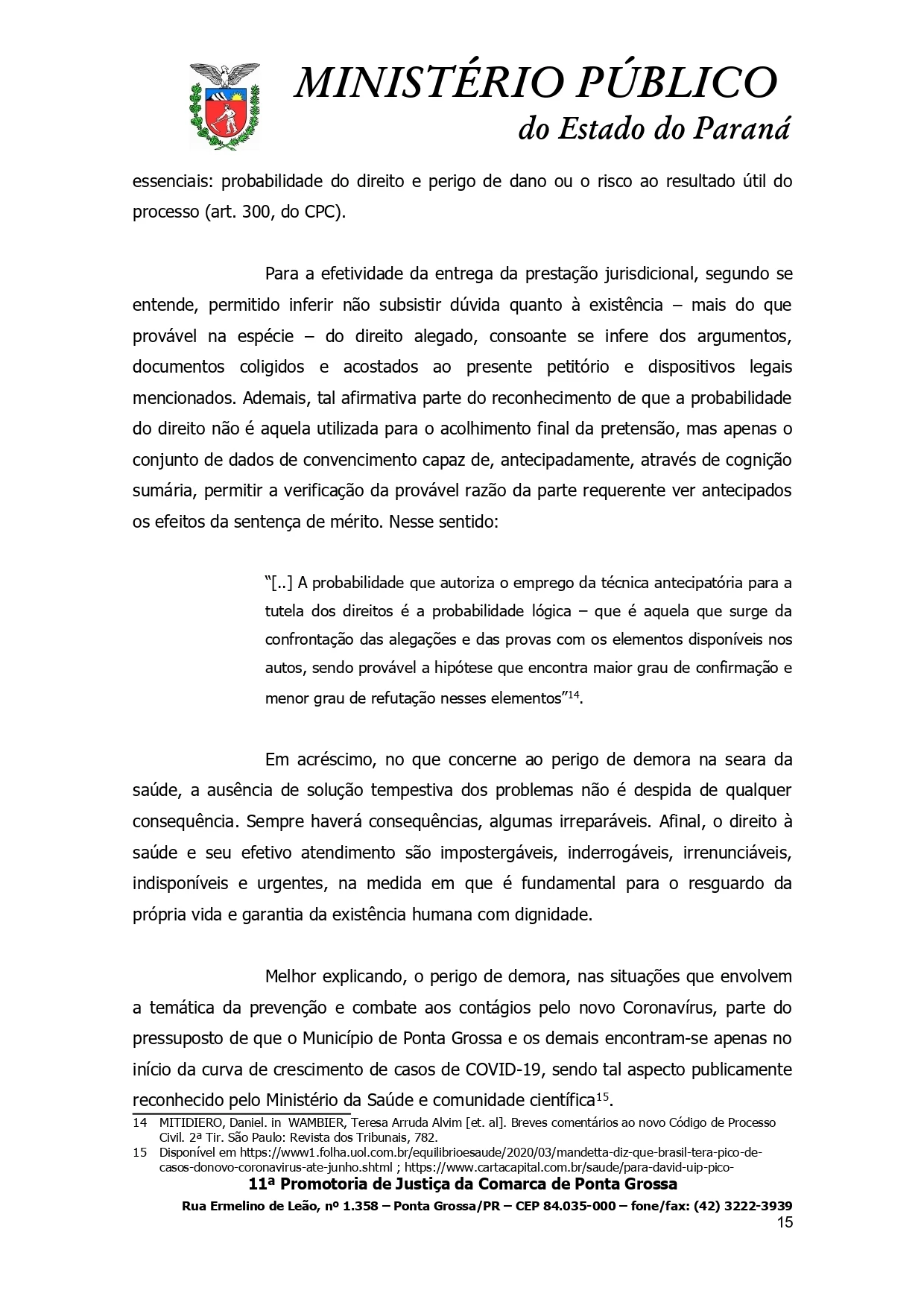 "No mesmo dia, foram publicados decretos com flexibilizações ainda maiores quanto ao isolamento social, permitindo a abertura de outros ramos varejistas e retorno de serviços de alimentação em restaurantes e lanchonetes. Há ainda notícia de que a prefeitura municipal pretende permitir a abertura, ainda nesta quarta feira (15), das academias da cidade", justifica.