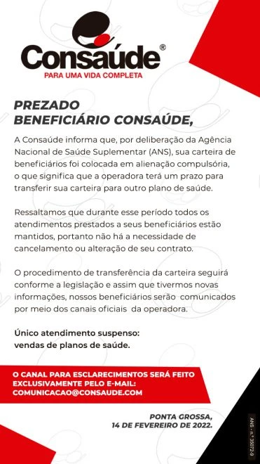 D'Ponta News entrou em contato com a assessoria de imprensa da Consaúde e enviou algumas questões sobre como ficará a situação dos clientes dos planos e o que levou a ANS a tomar a decisão. Em resposta, foi encaminhado o seguinte informativo: