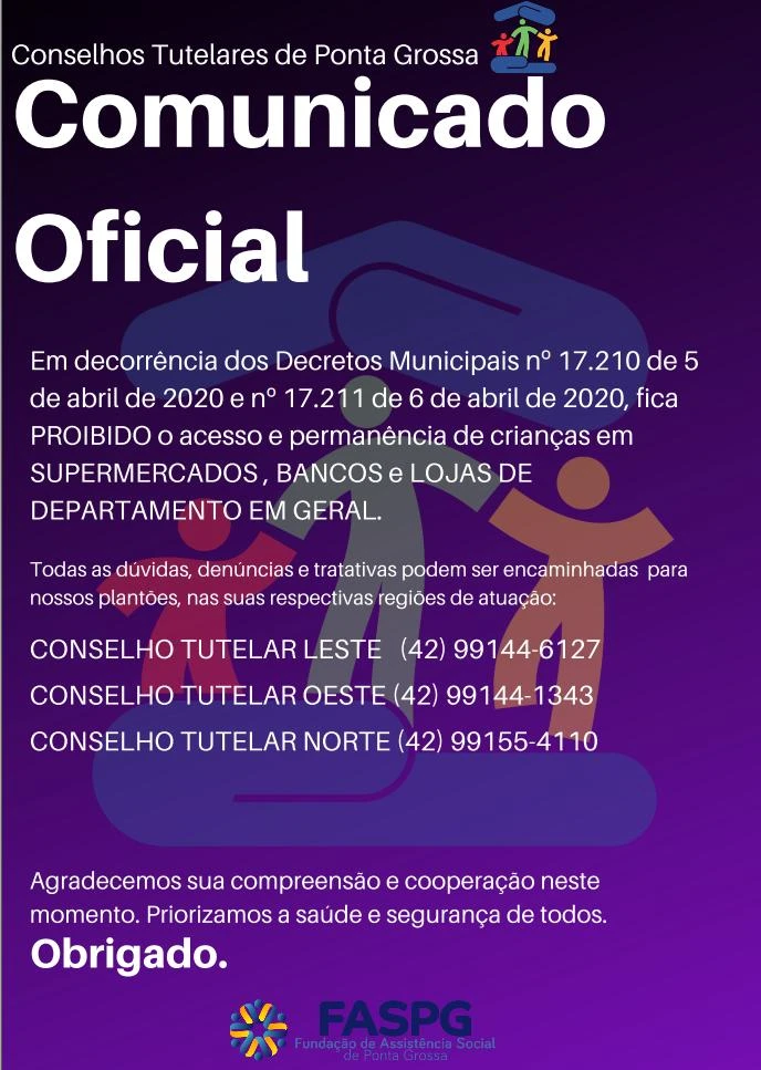 Sobre isso, a Fundação de Assistência Social de Ponta Grossa orienta que não será permitida a entrada de crianças nesses estabelecimentos estabelecidos via decreto. Em caso de dúvida, deve ser acionado os seguintes Conselhos Tutelares: