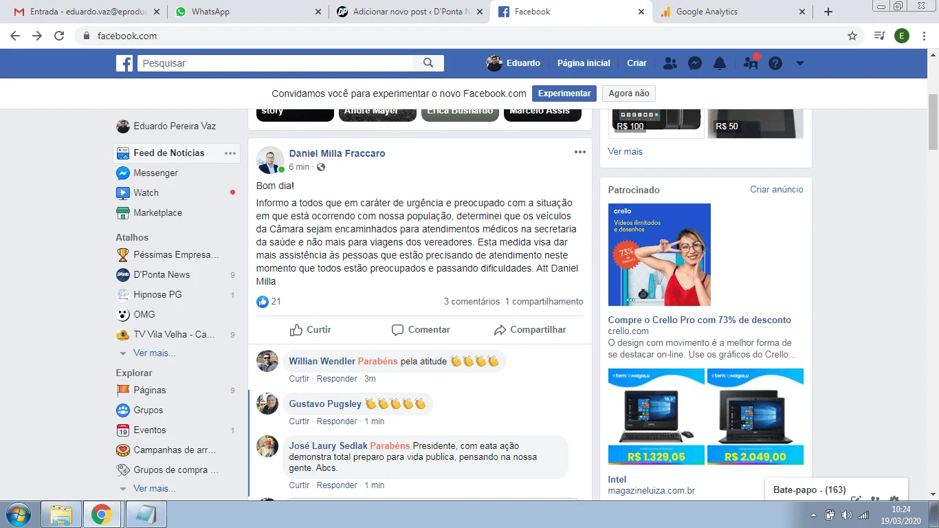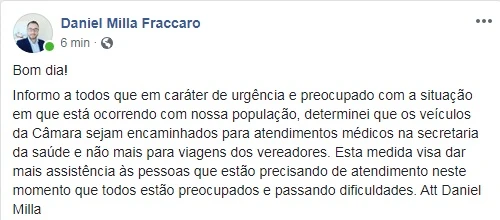 O presidente da Câmara Municipal de Ponta Grossa, vereador Daniel 'Milla' Fracaro (sem partido), anunciou nas redes sociais nesta quinta-feira (19) a transferência temporária dos veículos do Legislativo para a Secretaria de Saúde.