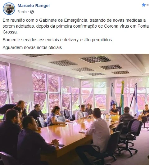 O prefeito Marcelo Rangel divulgou nas redes sociais na tarde deste sábado, 21, uma imagem em que aparece junto com secretários e responsáveis por áreas essenciais do município. No título, explicou a imagem confirmando que era uma "reunião com o Gabinete de Emergência, tratando de novas medidas a serem adotadas, depois da primeira confirmação de Corona vírus em Ponta Grossa".