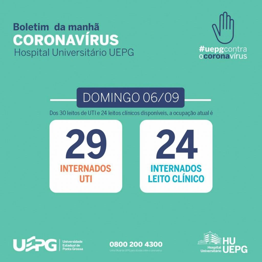 De acordo com o boletim oficial divulgado pelo Hospital Universitário dos Campos Gerais (HU-UEPG) na tarde deste domingo (06), a ala destinada para tratamento de pacientes de coronavírus apresenta níveis críticos de ocupação. Todos os 24 leitos clínicos encontram-se ocupados. Já dos 30 leitos de UTI, 29 estão ocupados.