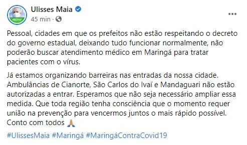 O prefeito também afirmou que estão sendo organizadas barreiras nas entradas de Maringá. "Ambulâncias de Cianorte, São Carlos do Ivaí e Mandaguari não estão autorizadas a entrar. Esperamos que não seja necessário ampliar essa medida. Que toda região tenha consciência que o momento requer união na prevenção para vencermos juntos o mais rápido possível", escreveu o prefeito Ulisses Maia.