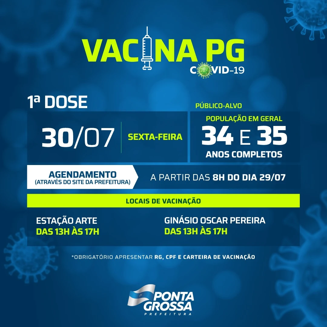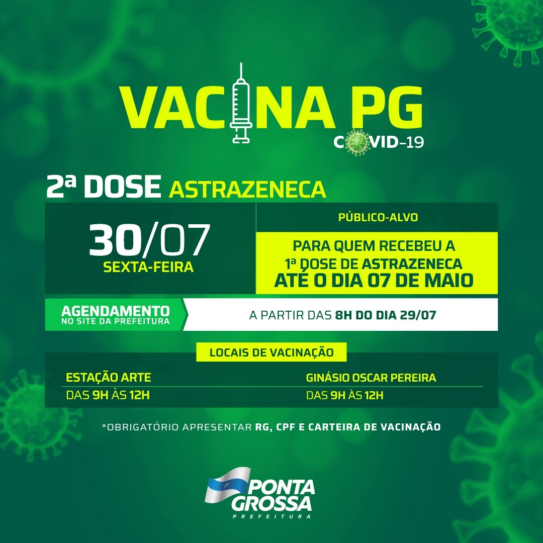 www.pontagrossa.pr.gov.br). O agendamento estará aberto a partir das 8h desta quinta-feira (29). A vacinação deste público necessita da apresentação do RG, CPF e carteira de vacinação.