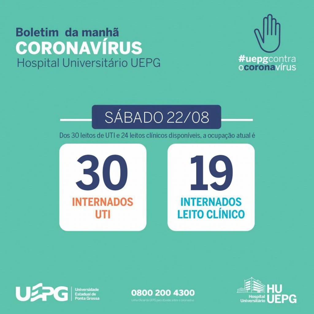 De acordo com o boletim divulgado na manhã deste sábado (22), não há mais leitos de UTI disponíveis para tratamentos de infectados com COVID-19 no Hospital Universitários dos Campos Gerais (HU-UEPG). Todos os 30 leitos disponíveis encontram-se ocupados no momento.