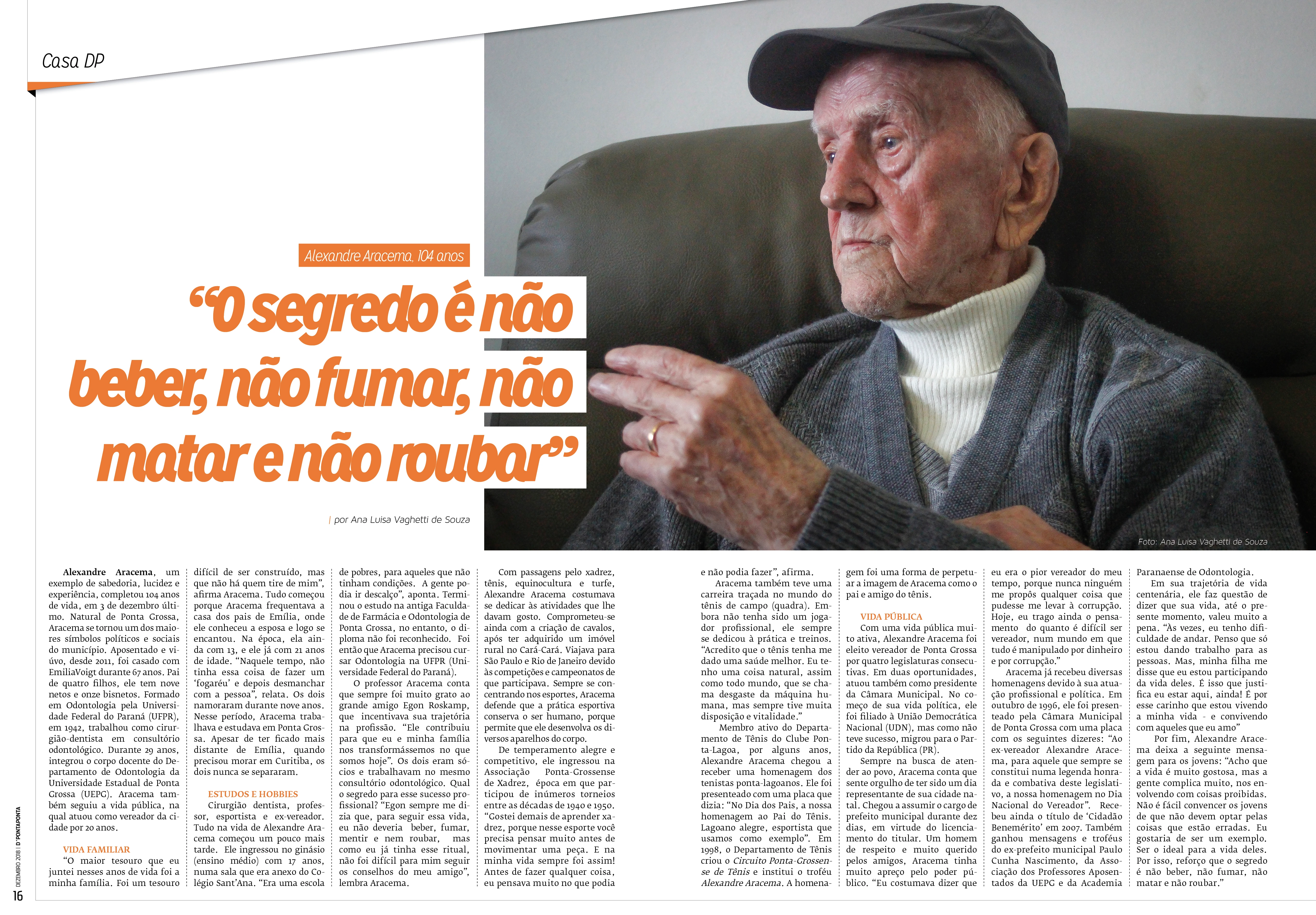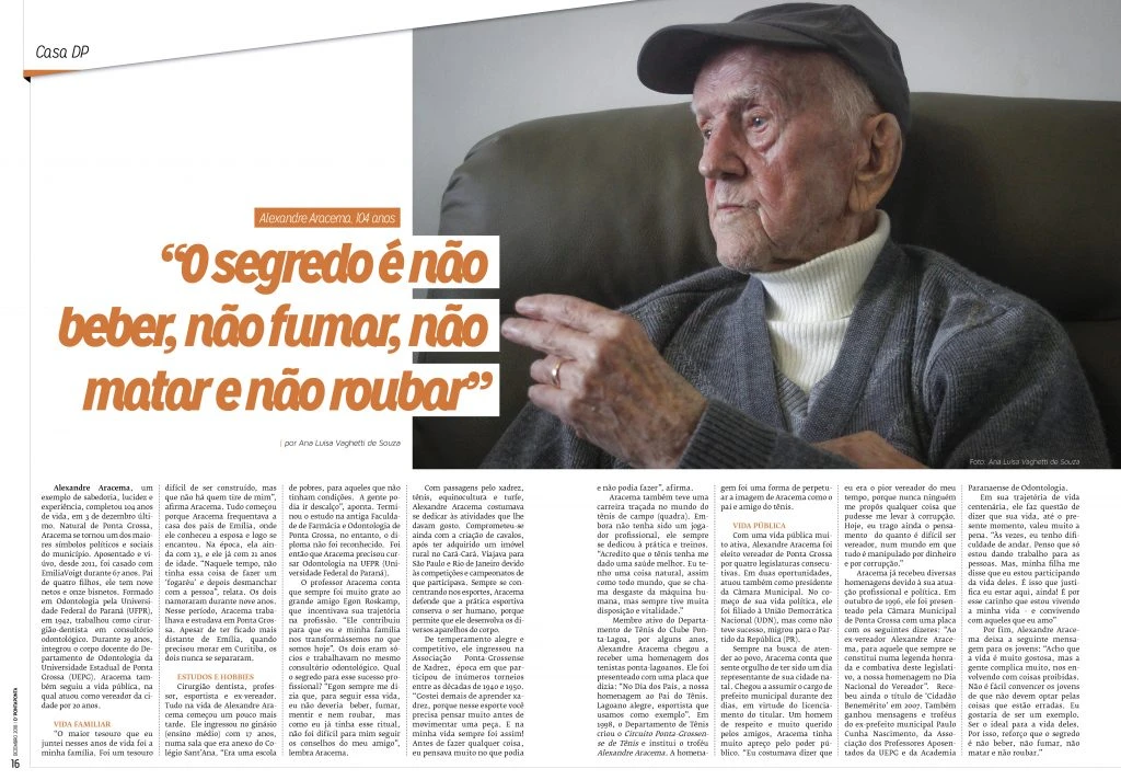 Alexandre Aracema, um exemplo de sabedoria, lucidez e experiência, completou 104 anos de vida, em 3 de dezembro último. Natural de Ponta Grossa, Aracema se tornou um dos maiores símbolos políticos e sociais do município. Aposentado e viúvo, desde 2011, foi casado com EmiliaVoigt durante 67 anos. Pai de quatro filhos, ele tem nove netos e onze bisnetos. Formado em Odontologia pela Universidade Federal do Paraná (UFPR), em 1942, trabalhou como cirurgião-dentista em consultório odontológico. Durante 29 anos, integrou o corpo docente do Departamento de Odontologia da Universidade Estadual de Ponta Grossa (UEPG). Aracema também seguiu a vida pública, na qual atuou como vereador da cidade por 20 anos.