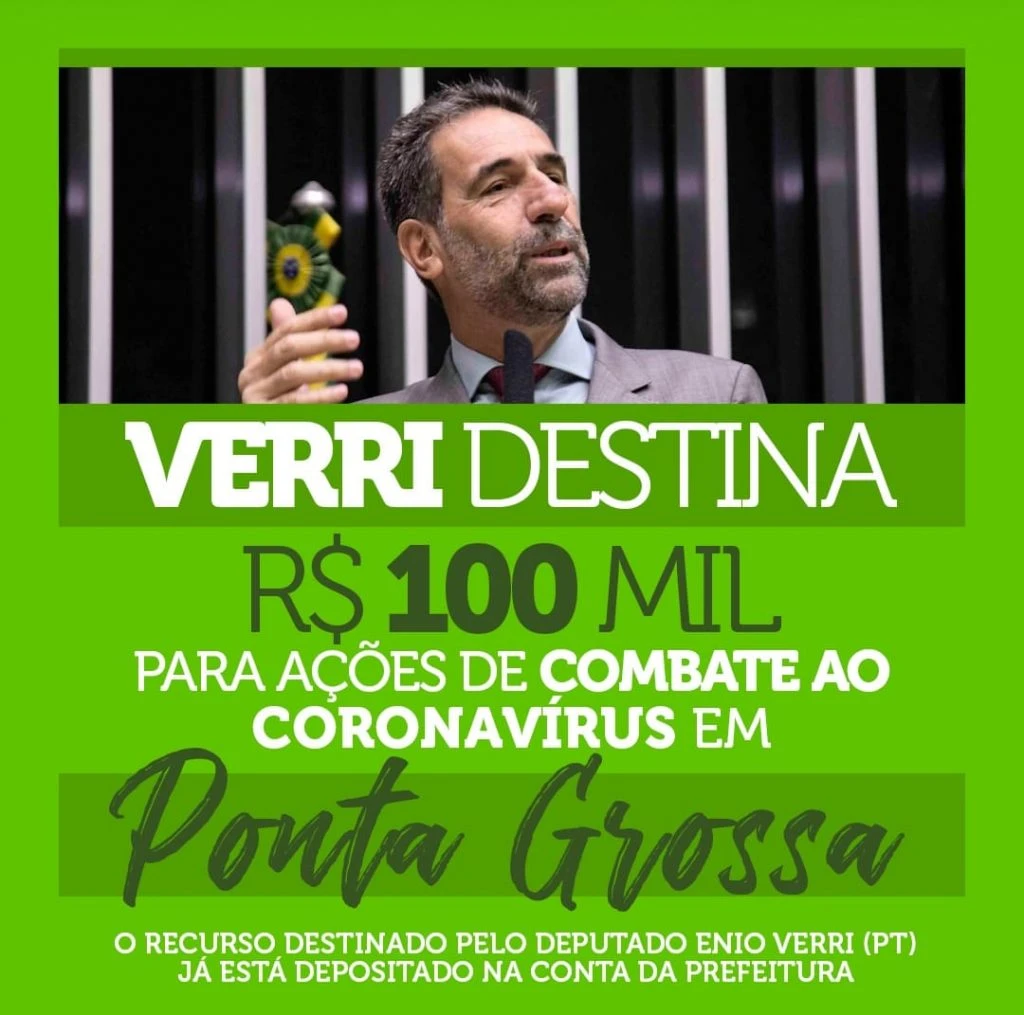 O deputado federal pelo Paraná, Enio Verri (PT), destinou no início do mês de julho, o valor de R$ 100 mil para o combate à Covid-19 em Ponta Grossa.