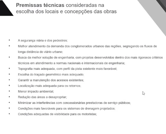 Confira a premissa técnica das obras: