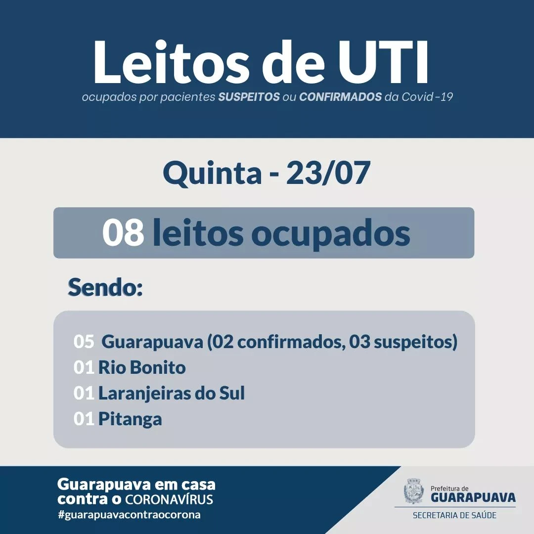 A Prefeitura Municipal de Guarapuava divulgou os números atualizados da covid-19 no município. O boletim oficial de quinta-feira, 23, revela que cinco novos casos foram registrados na cidade em 24 horas, chegando a 357 infectados pelo novo coronavírus. Destes, 305 estao recuperados, 46 em isolamento domiciliar, 02 internados e 04 não resistiram e acabaram morrendo em decorrência da doença.