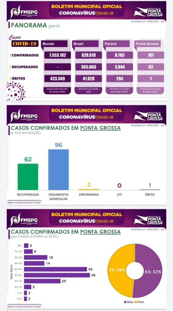 A cidade de Ponta Grossa confirmou, na tarde deste sábado (13) dez novos casos de coronavírus. Ao todo, 161 pessoas foram infectadas no município. Destas, 98 estão com o vírus ativo no organismo, as outras 62 estão recuperadas e um paciente acabou morrendo em decorrência da covid-19. As informações são do boletim oficial divulgado pela Prefeitura Municipal.