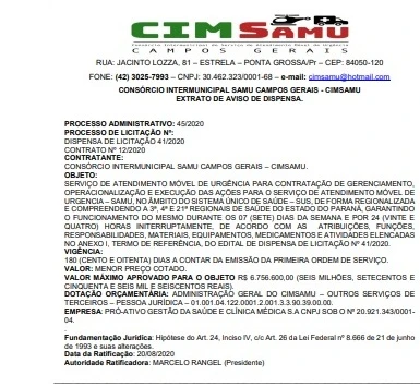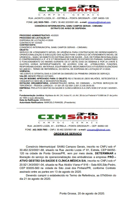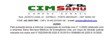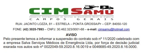 Na tarde desta sexta-feira (21), o Diário Oficial do Município de Ponta Grossa trouxe o aviso de suspensão de contrato com a empresa Salva Serviços Médicos de Emergência Ltda por parte do CIMSAMU (Consórcio Intermunicipal do Serviço de Atendimento Móvel de Urgência) . A empresa era responsável por operar os serviços de gerenciamento, execução e operacionalização do Samu (Serviço de Atendimento Móvel de Urgência). A decisão se baseia por força de decisão judicial.