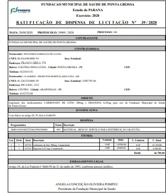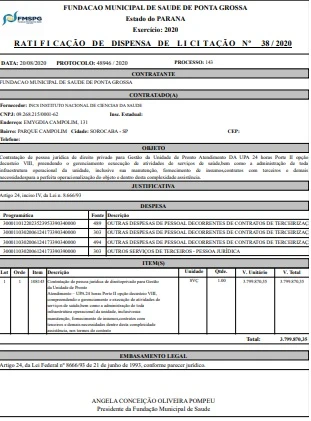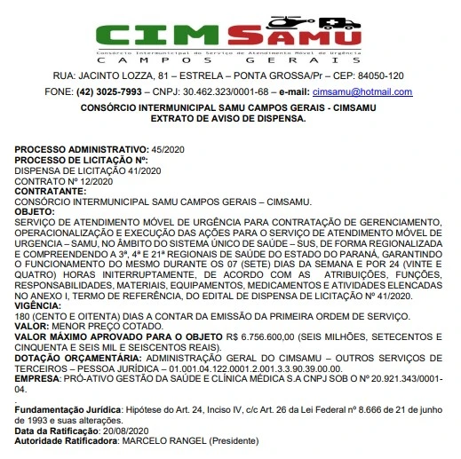 Na decisão, fica explícito o dever de cumprir com os atendimentos 7 dias na semana, 24 horas por dia, atendendo as 3ª, 4ª e 21ª Regionais de Saúde do Paraná. O documento traz ainda o edital de dispensa de licitação para a contratação da nova empresa que irá prestar os serviços. Com relação ao valor, o máximo aprovado para o objeto é de R$ 6.756.600,00.