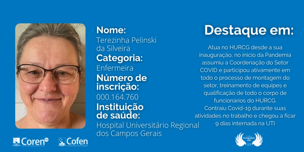 “A decisão de indicar a Terezinha partiu de uma conversa com demais colegas, pois ela foi de fundamental importância na montagem da Ala Covid-19”, explica a chefe do setor de enfermagem, Regiane Maria Hoeldtke. A enfermeira destaca o talento da colega. “Sempre ativa, trabalhando em prol de todos, participou ativamente dos treinamentos e capacitações, dedicou-se integralmente aos pacientes e funcionários”, relembra.