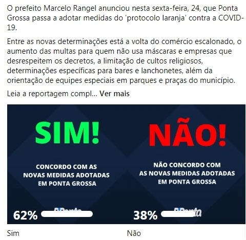 Por isso, o D’Ponta News lançou na página do portal no Facebook uma enquete para saber a opinião da população sobre as novas medidas adotadas pelo município no combate à COVID-19. Cerca de mil pessoas responderam a enquete e 62% delas se dizem a favor das novas medidas e 38% são contrárias.