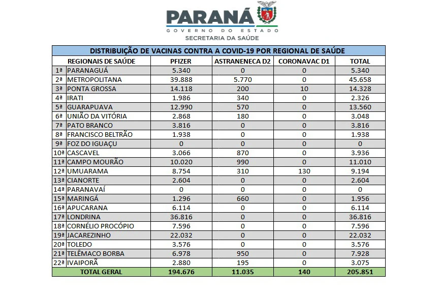 A Secretaria de Estado da Saúde (Sesa) distribui nesta terça-feira (30) mais 205.851 doses de vacinas contra a Covid-19 para as suas 22 Regionais no Paraná. Os imunizantes são referentes à 70ª pauta do Ministério da Saúde e destinados à primeira dose de adolescentes (D1), doses reforço e segunda dose (D2) das pessoas que já iniciaram o esquema vacinal.