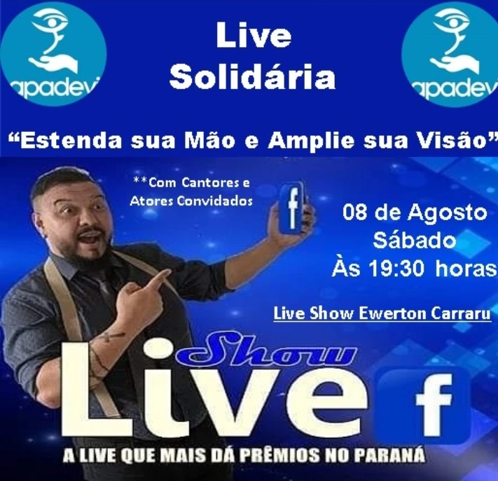 O primeiro deles é uma Live Solidária com o artista Ewerton Carrau, no sábado, 8 de agosto, às 19h30, no Facebook da Apadevi. A live de nome "Estenda sua mão e amplie sua visão" promete animar os ponta-grossenses com música, humor, entretenimento e sorteio de prêmios.