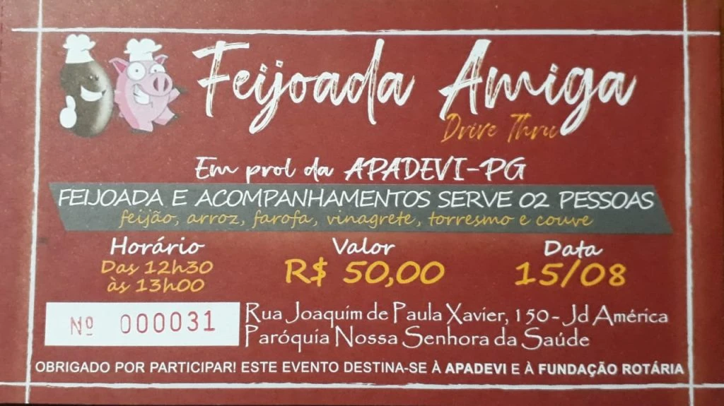 O segundo evento do mês de agosto é a 'Feijoada Amiga' que será feita no formato drive-thru e tem o valor de R$50,00 para duas pessoas. Além da feijoada, o menu acompanha arroz, farofa, vinagrete, torresmo e couve. Quem tiver interesse em comprar os convites pode entrar em contato pelo telefone da Apadevi - (42) 3223-0784.