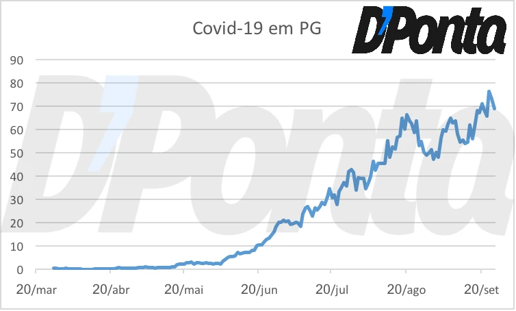 O gráfico mostra que Ponta Grossa estava vendo uma queda no registro de novos pacientes diagnosticados com COVID-19 e agora voltou a apresentar uma clara tendência de subida. Provavelmente a subida no número de casos foi causada pelas aglomerações registradas durante o feriado prolongado do Dia da Independência.