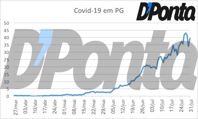 O gráfico mostra que a média móvel do número de casos de coronavírus em Ponta Grossa cresceu 36% nas últimas duas semanas em relação ao mesmo período anterior. É possível perceber que o município estava registrando uma tendência de queda na última semana seguida, provavelmente causada pelo represamento de testes no Laboratório Central do Estado entre os dias 23 e 25 de julho. Assim que eles foram liberados os números voltaram a crescer e bateu recorde de 71 novos casos de Covid-19, divulgados ontem (30).