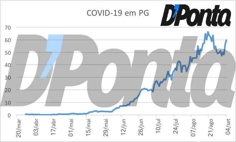 O gráfico mostra que Ponta Grossa estava seguindo uma tendência de queda acentuada no registro de novos pacientes diagnosticados com COVID-19, porém o número de casos registrados diariamente voltou a crescer. Provavelmente essa mudança foi causada pelas comemorações do Dia dos Pais e pelo registro de 101 novos pacientes na quarta-feira (2).