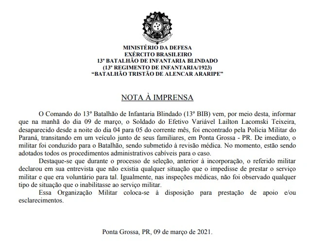Na tarde desta terça-feira (9) o Comando do 13º Batalhão de Infantaria Blindado (13º BIB) divulgou uma nota oficial afirmando que o soldado Lailton Lacomski Teixeira foi encontrado pela Polícia Militar, transitando em um veículo junto dos familiares, em Ponta Grossa.