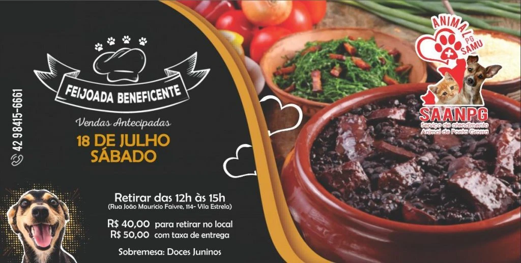 No dia 18 de julho, sábado, acontece uma feijoada beneficente em prol do SAMU Animal, o evento é para ajudar a entidade que hoje conta com poucos recursos devido à pandemia da Covid-19. A organização da ação é dos próprios colaboradores do projeto que atende os animais machucados e abandonados de Ponta Grossa.