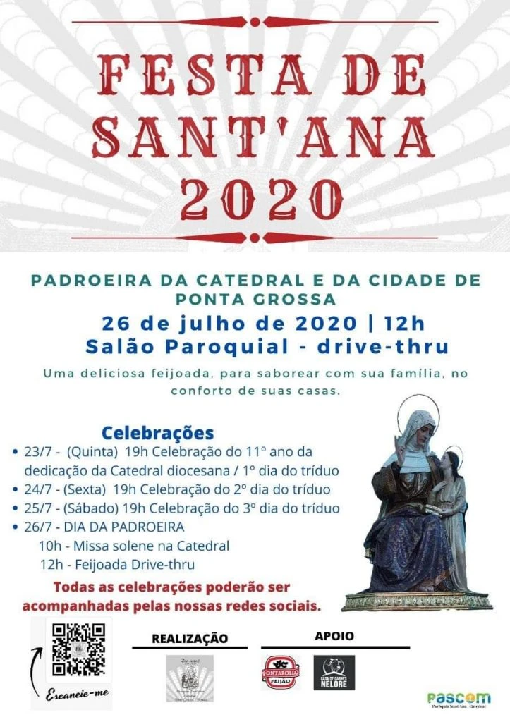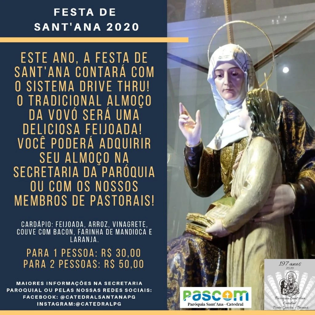 A Festa de Sant'Ana 2020 acontece no dia 26 de julho e as celebrações foram divulgadas pela Paróquia Sant'Ana, a Igreja da Catedral de Ponta Grossa. Confira abaixo como fazer para participar e contribuir com a festividade da padroeira de Ponta Grossa.