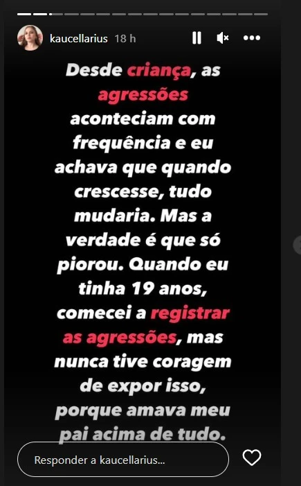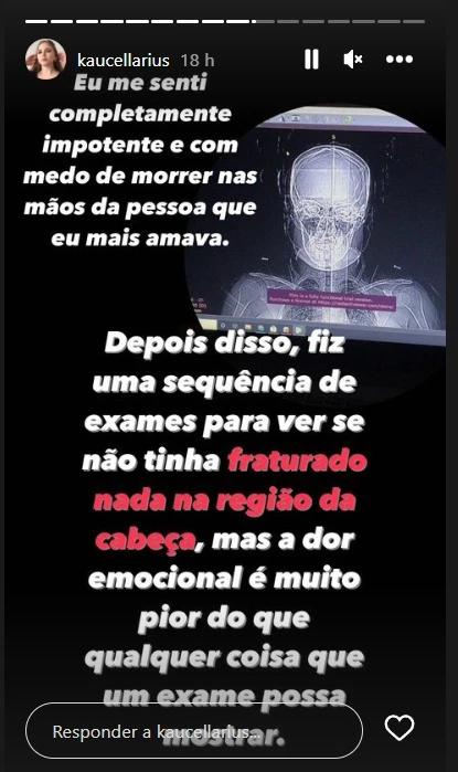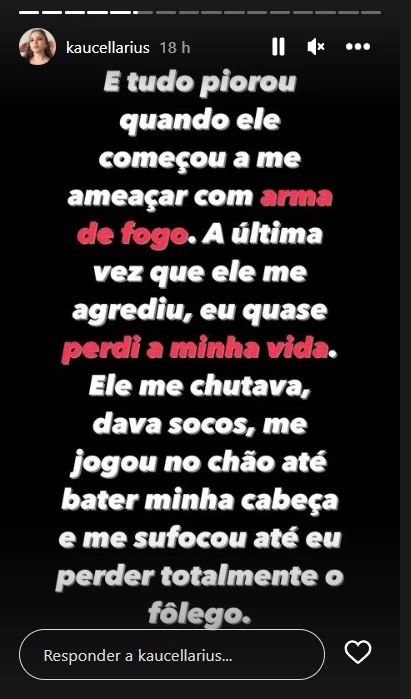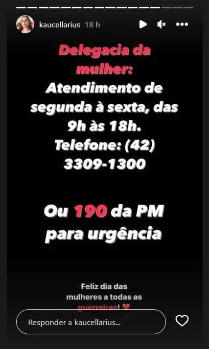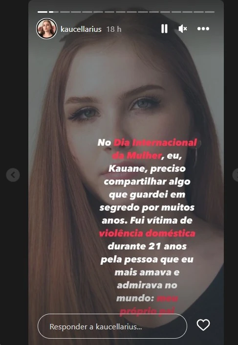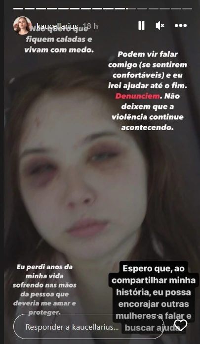 Após o desabafo, Kauane Cellarius incentiva que mulheres vítimas de violência doméstica façam denúncias contra os agressores. "Não deixem que a violência continue acontecendo. Espero que, ao compartilhar a minha história, eu possa encorajar outras mulheres a falar e buscar ajuda", diz.