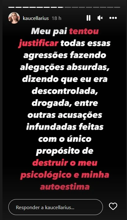 Procurada pelo portal D'Ponta News, Kauane Cellaurius esclarece que obteve uma medida protetiva contra o pai após a última agressão em 2021, a qual foi estendida para o ano de 2023. Kauane ainda afirma que a audiência sobre o caso deverá acontecer somente em agosto de 2024. "Fiz isso porque eu quero Justiça e também para incentivar outras mulheres que passam por situações parecidas a não terem medo de denunciar, que não fiquem caladas por conta da dor, nem sintam medo", diz.