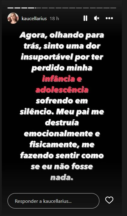 Kauane afirma que guardou este segredo por muitos anos porque, acima de tudo, amava o pai. Ela conta que as agressões aconteciam com frequência desde a infância. "Agora, olhando para trás, sinto uma dor insuportável por ter perdido minha infância e adolescência sofrendo em silêncio. Meu pai me destruía emocionalmente e fisicamente, me fazendo sentir como se eu não fosse nada", completa.