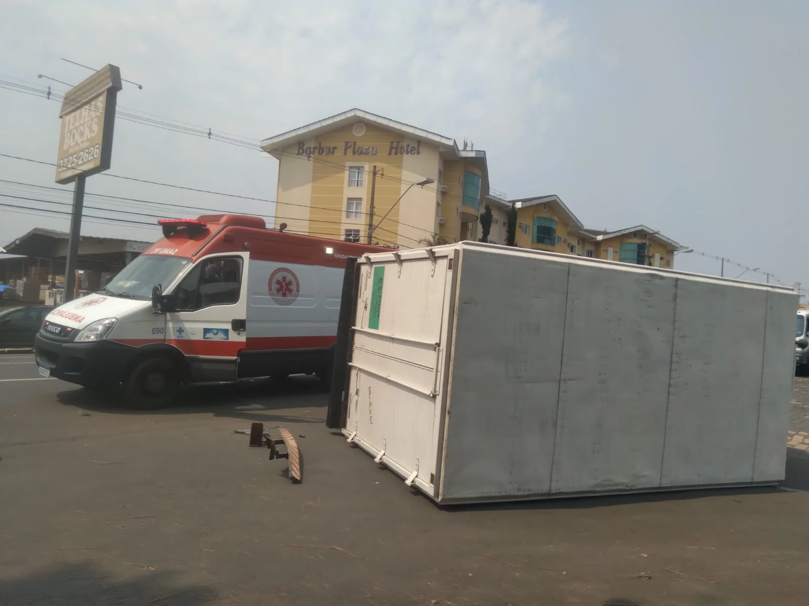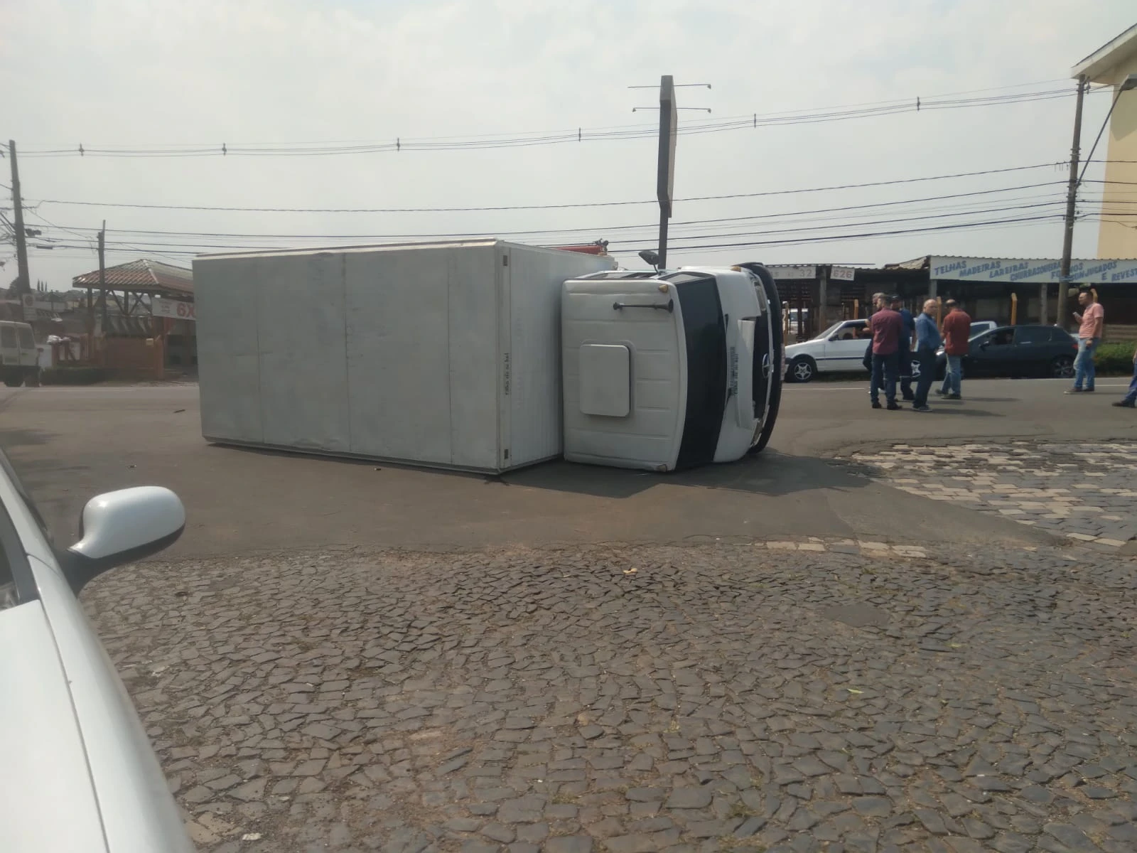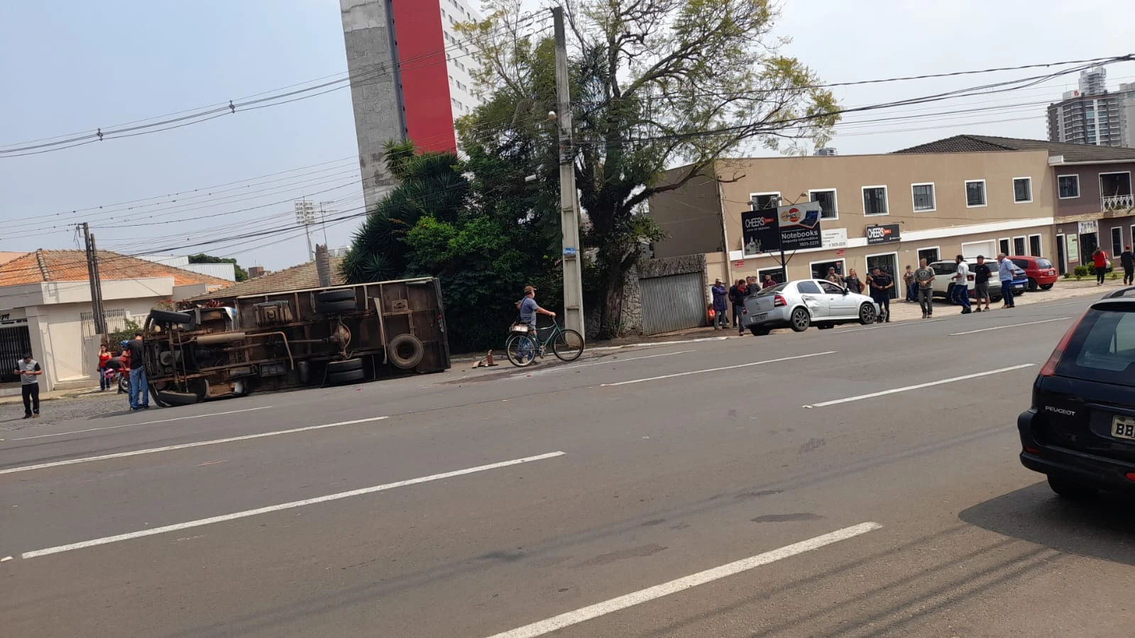 Um caminhão do tipo baú tombou após se envolver em acidente com um automóvel Chevrolet Astra, na manhã desta sexta-feira (9), na Avenida Visconde de Mauá, em frente a um posto de combustíveis, na região de Oficinas, em Ponta Grossa.