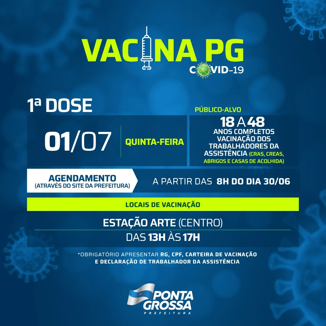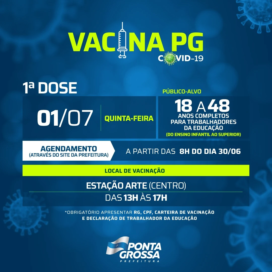 A Prefeitura de Ponta Grossa, através da Fundação Municipal de Saúde (FMS), definiu o cronograma de vacinação para quinta-feira (1). O agendamento para receber as doses será feito pelo site oficial (https://www.pontagrossa.pr.gov.br/) a partir de amanhã (30), às 8h.