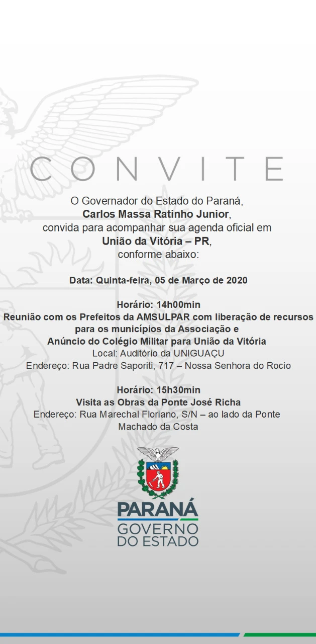Na tarde da próxima quinta-feira (05), o governado Ratinho Júnior estará em União da Vitória cumprindo sua agenda oficial. O encontro, que começa às 14h no auditório do Centro Universitário do Vale do Iguaçu, irá tratar sobre a liberação de recursos para os municípios da AMSULPAR (Associação dos Municípios Sul Paranaense) e a instalação do Colégio Militar na cidade. Às 15h30 o governador segue para uma visita às obras da ponte José Richa.
