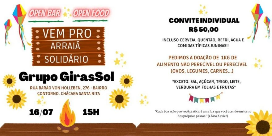 O Grupo GirasSol, que atua na região em prol da caridade e levando alimentos aos mais necessitados, realiza na tarde deste sábado (16) o seu Arraiá Solidário.