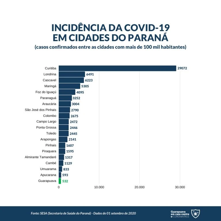 Em perspectiva estadual, Guarapuava se mantém desde o início da pandemia com um dos coeficientes de incidência de Covid-19 mais baixos do Paraná, tendo o menor número de casos confirmados entre as 20 maiores cidades do Paraná, conforme dados da Sesa (Secretaria de Estado de Saúde) há mais de 30 dias.